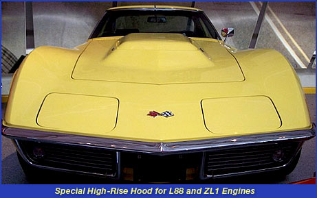 A special hood was designed for the 427 engine equipped Corvette, with a raised bulge to fit the big block engine under the hood. The L-88 Engine equipped Corvettes have an even higher hood bulge to accommodate the high-rise aluminum intake manifold.