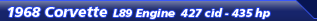 The 427 cid L-89 engine was rated at 435 horsepower and equipped with three two barrel carburetors and square port aluminum heads for maximum high RPM air flow.