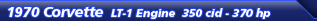 The 1970 Corvette LT1 is equipped with a high performance 350 cid engine rated 370 hp. The LT1 engine equipped Corvettes also used the Chevrolet big block raised hood with LT1 decals and stripes. A special high performance option package coded ZR1 was offered with the LT1 engine, M22 close ratio four speed manual transmission, heavy duty brakes, manual steering, special suspension components, an aluminum radiator and transistor ignition.