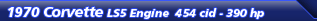 The other available engines are the base (L48) 350 cid small block engine, the LT1 350 cid high performance small block engine and the 454 cid big block Chevy LS5 engine rated at 365 hp.