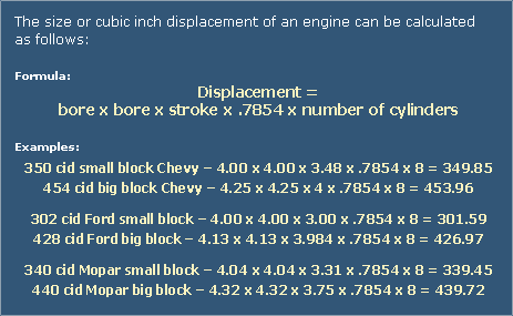 A performance evaluation of an engine can be calculated by the use of a horsepower to cubic inch formula. A modified high performance engine should be capable of producing a minimum of one horsepower per cubic inch of displacement.