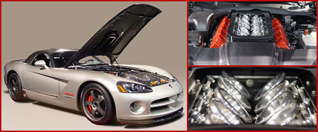 The PVO engineers proceeded to enhance performance by reducing weight and increasing Viper engine power. The carbon-fiber material and the ultra-lightweight (SRT) Street and Racing Technology forged aluminum wheels helped to reduce standard SRT-10 vehicle weight by 150 lbs. Viper Competition Coupe race engine components increased V10 engine performance to 625 horsepower with the use of cowl induction, a throttle body intake with 10 aluminum velocity stacks, and modified cylinder heads with oversized intake and exhaust valves.