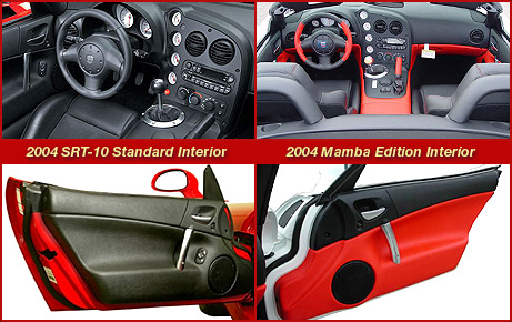The 2004 model year Viper SRT-10 is offered with a dramatic option, referred to as the “Mamba” which consists of upgraded interior colors of Bright Metallic Silver along with Red and Black.